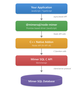 The driver includes a C++ native addon that calls the Mimer SQL C API functions directly using Node-API (N-API v8). This is the same C API used by Mimer’s official ODBC, JDBC, and ADO.NET drivers. Since the addon uses Node-API, the pre-built binaries are stable across Node.js versions — no recompilation is needed when you upgrade Node.js.